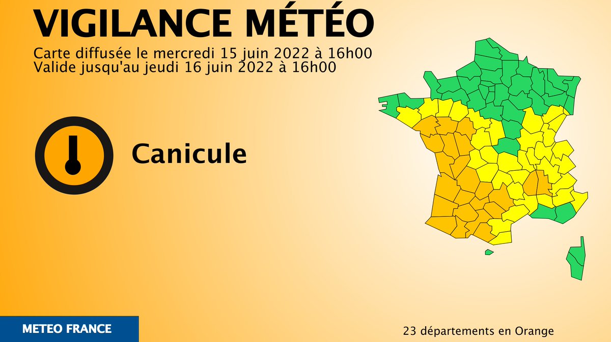 Depuis ce mercredi 15 juin Météo France a placé 23 départements en alerte orange canicule et 19 départements en vigilance jaune en publiant sa carte de vigilance météorologique. 2 days agoAlors que Météo France engageait ce mercredi une vigilance canicule orange pour 23 départements allant du Sud-Ouest aux Pays-de-la-Loire ce sont désormais 12 départements français qui sont. Météo-France a étendu la vigilance rouge canicule à 14 départements.